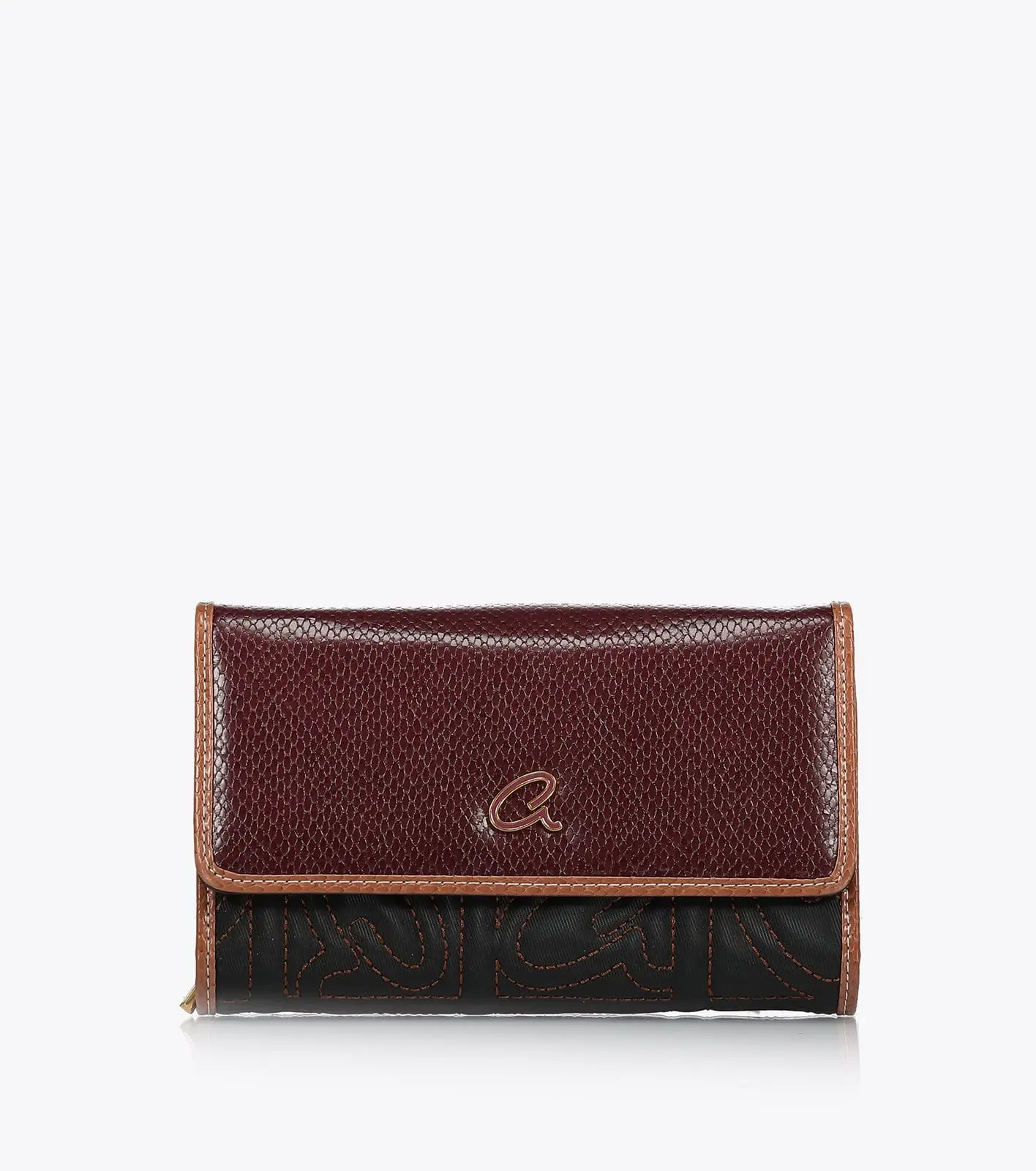 Γυναικείο πορτοφόλι τριών θέσεων που διπλώνει, κατασκευασμένο από συνθετικό δέρμα. Διαθέτει ανάγλυφο μονόγραμμα και κροκό λεπτομέρειες. Κλείνει με μεταλλικό κούμπωμα στο καπάκι. Περιέχει θήκες για χαρτονομίσματα, κέρματα και κάρτες. Μεταφέρετε τα χρήματα σας με ασφάλεια και στιλ.