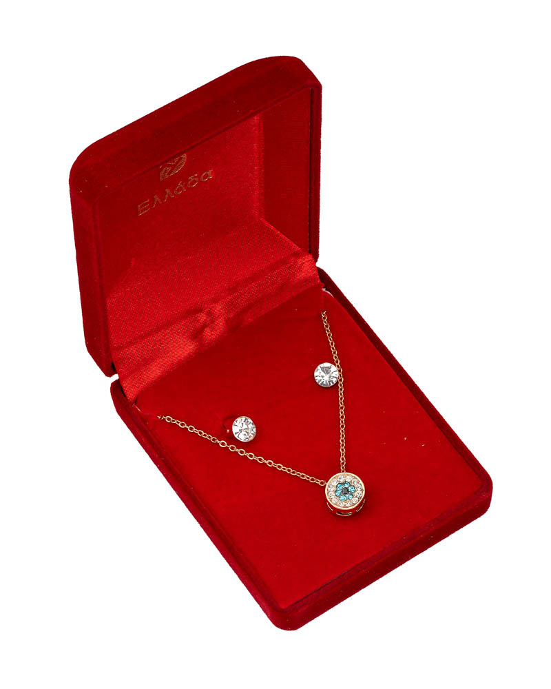 To σετ περιλαμβάνει: 1 Κολιέ με στρόγγυλο ματάκι με γαλάζιες πέτρες και καρφωτά σκουλαρίκια. Ένα εντυπωσιακό δώρο για κάθε περίσταση!